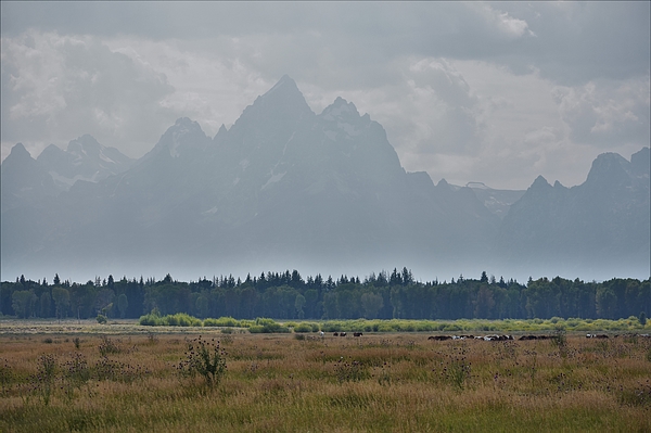 Even through thick, hazy clouds the Tetons loom in majesty above horses grazing at Elk Ranch Flats.